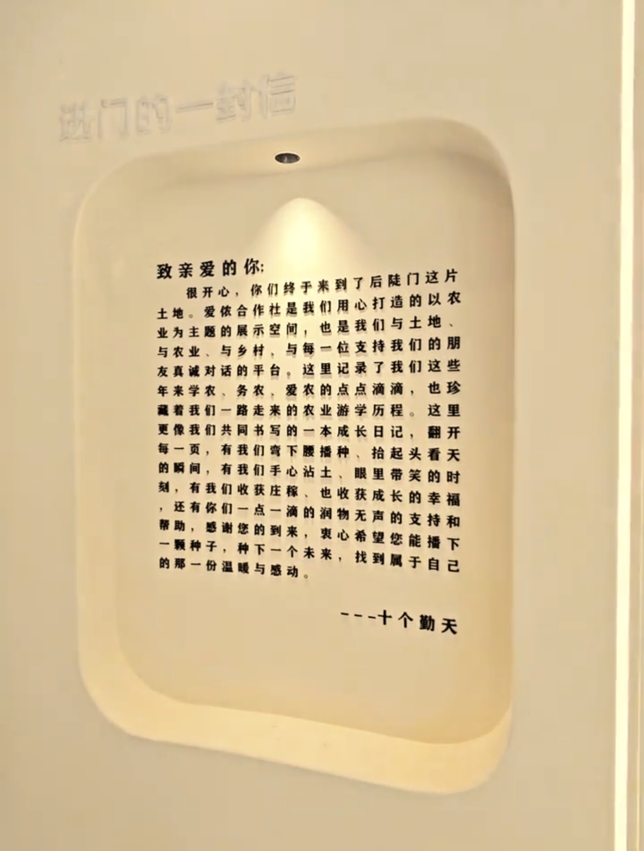 很开心,你们终于来到了后陡门这片土地。爱侬合作社是我们用心打造的以农业为主题的展示空间,也是我们与土地、与农业、与乡村,与每一位支持我们的朋友真诚对话的平台,这里记录了我们这些年来学农、务农、爱农的点点滴滴,也珍藏着我们一路走来的农业游学历程。这里更像我们共同书写的一本成长日记,翻开每一页,有我们弯下腰播种、抬起头看天的瞬间,有我们手心沾土、眼里带笑的时刻,有我们收获庄稼、也收获成长的幸福,还有你们一点一滴的润物无声的支持和帮助,谢您的到来,衷心希望您能播下一颗种子,种下一个未来,找到展于自己的那一份温暖与感动。