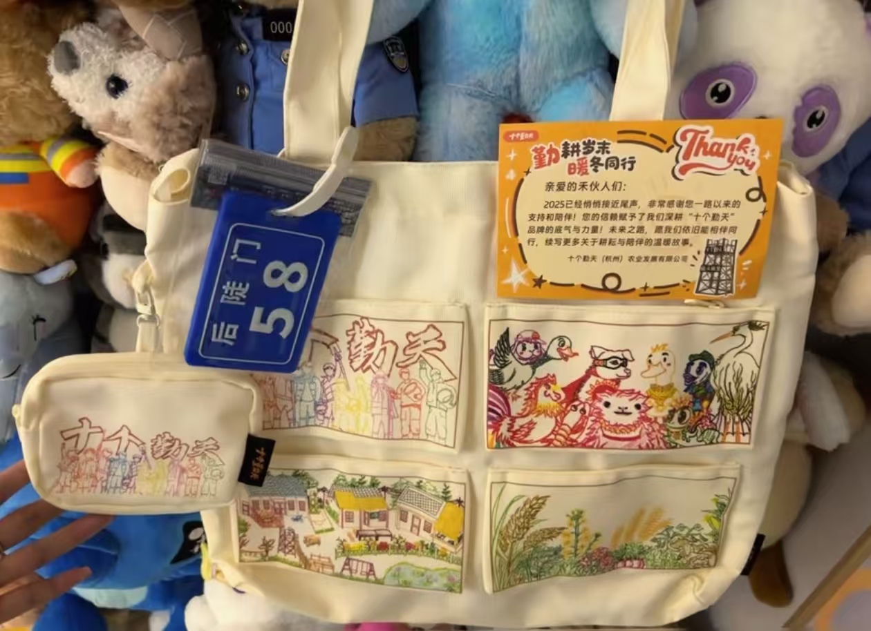 那天晚上我抱着包在沙发上滚了三圈,给八个朋友发了开箱视频,连我妈都探头问 “这包是啥宝贝啊,你抱着不撒手”。第二天我揣着它去买早餐,刚掏手机付款,炸油条的老板突然指着包喊 “你也是禾伙人?我抢了四次都没抢到!” 我俩站在冒着油香的铺子门口聊了十分钟,从少年们种小麦聊到包上那只翘着脚的小鸭子,最后老板多给了我一个煎蛋,说 “这是后陡门亲友专属福利”。走在路上时,风把包上的麦穗图案吹得轻轻晃,我攥着包带的手舍不得松 —— 原来这从来不是个普通的布袋子,是我蹲过的每一场直播、为少年们捏过的每一把汗,终于落了地的凭证。